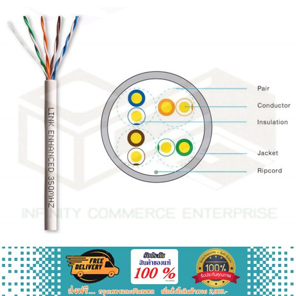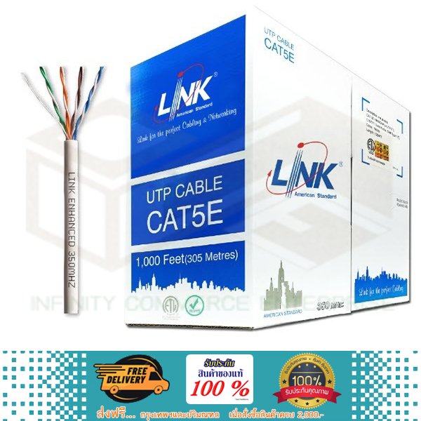 ใช้สำหรับเชื่อมต่อระบบเครือข่ายแบบสาย (LAN) ภายในบ้านหรือสำนักงาน สามารถรองรับความเร็วในการเชื่อมต่อ 10/100/1000 Mbps, สายเคเบิลใช้ความถี่ 350 MHz ความต้านทานไฟฟ้า 100 โอห์ม(Ohm), CAT 5E UTP Enhanced CABLE (350 MHz), LSZH, UL White 305 M./Pull BoxR, INDOOR CAT 5E Low Smoke Zero Halogen