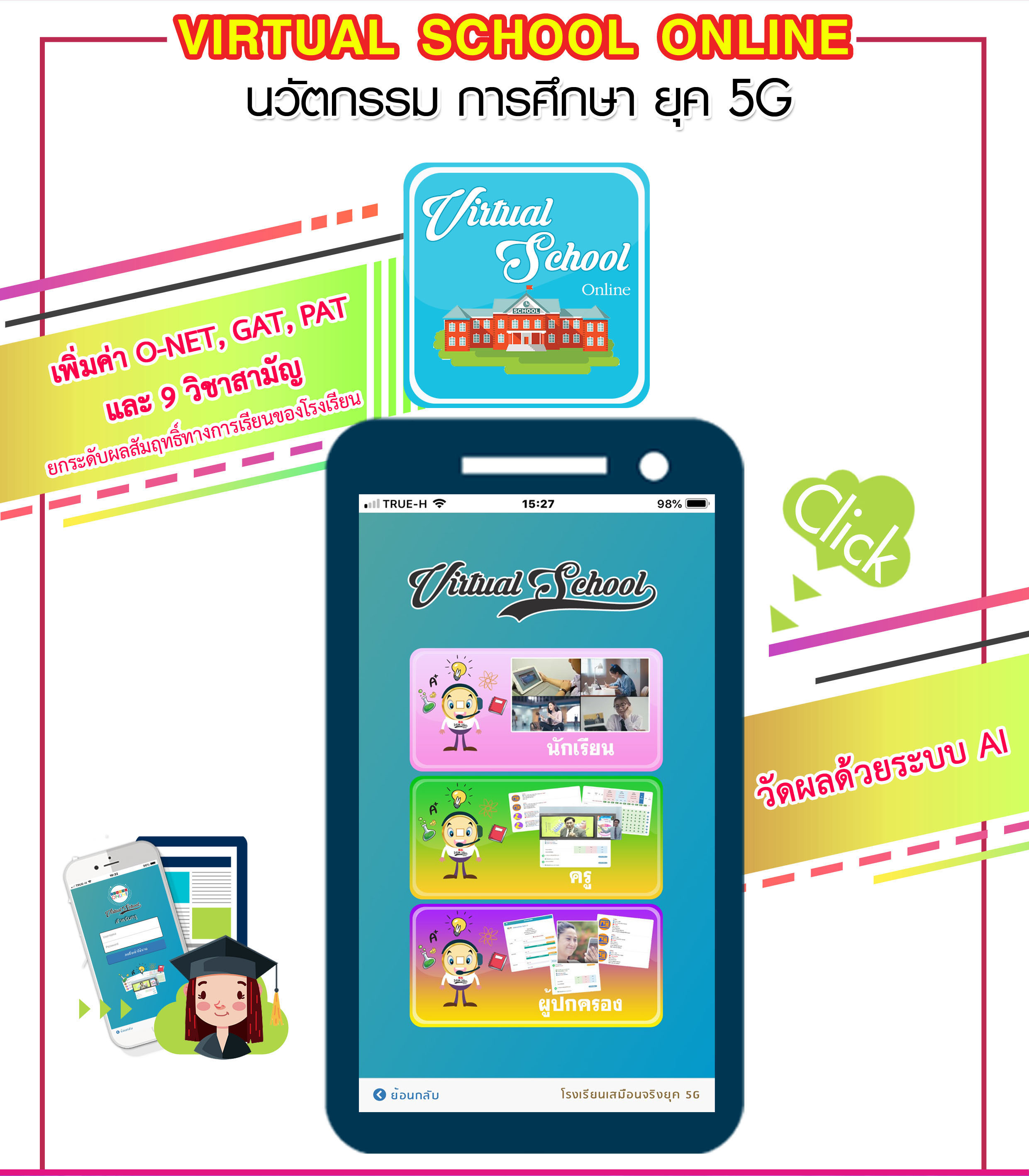 ระบบ virtual School Online เป็นนวัตกรรมใหม่ของการศึกษา เป็นโรงเรียนเสมือนจริงในยุคดิจิทัล ที่วัดผลสัมฤทธิ์ทางการเรียนด้วยระบบ Artificial Intelligence หรือ AI ระบบนี้จะเป็นเครื่องมือสำหรับโรงเรียน ครู และผู้ปกครอง ที่จะช่วยเพิ่มดคะแนน O-NET , GAT , PAT และ 9 วิชาสามัญ ของนักเรียนให้สูงขึ้น